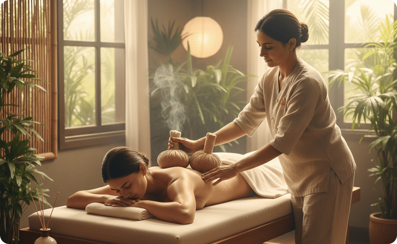 A deeply soothing Ayurvedic therapy using warm herbal pouches to relax muscles, ease pain, and removes stiffness.