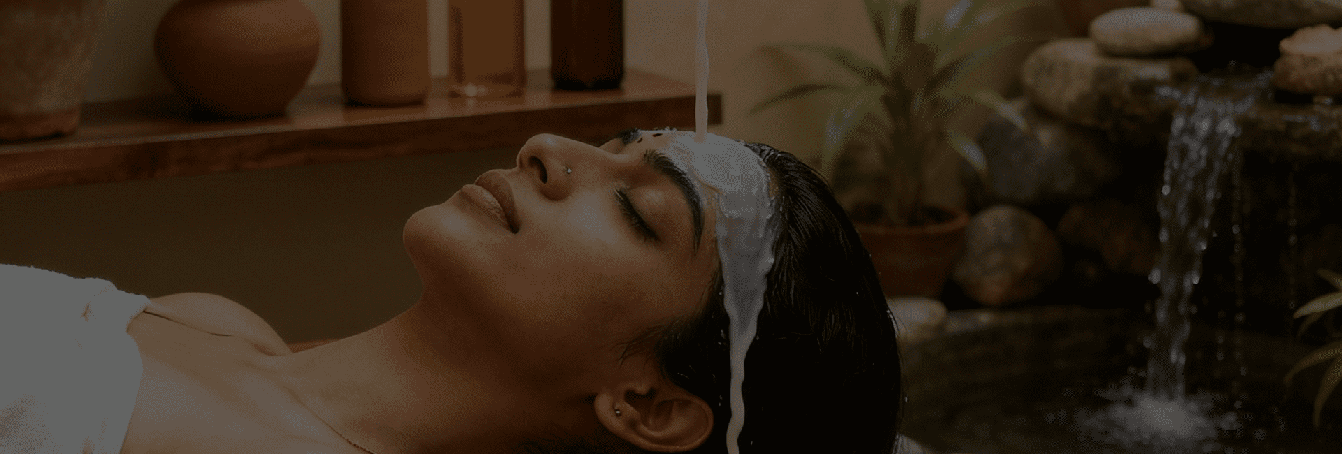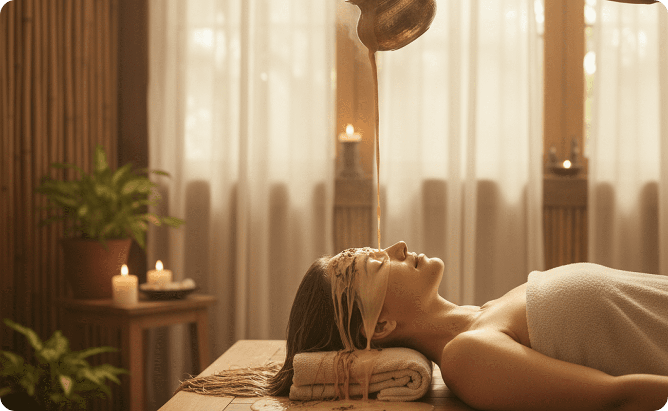 A soothing Ayurvedic therapy that streams lukewarm, herbal-infused milk gently over the forehead.