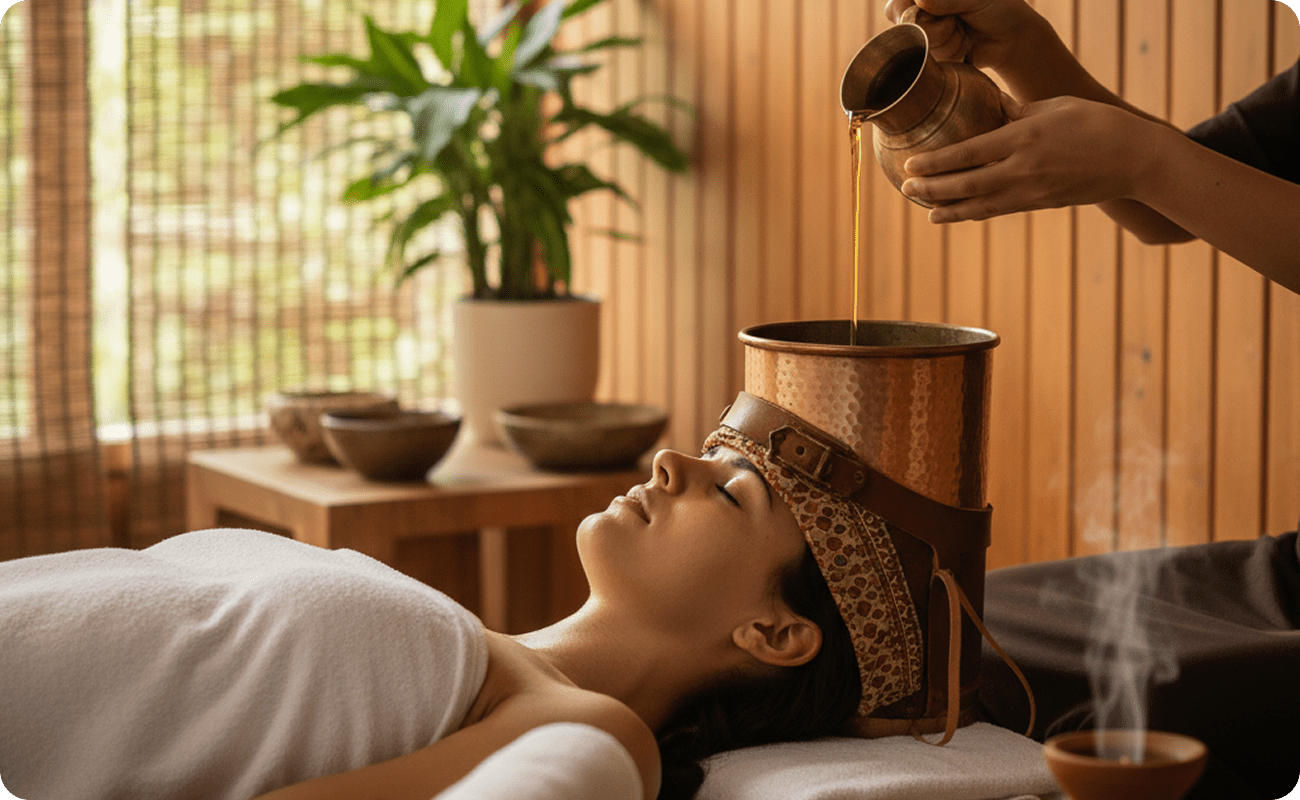 A deeply soothing Ayurvedic treatment where a gentle stream of warm herbal oil is poured over the forehead.